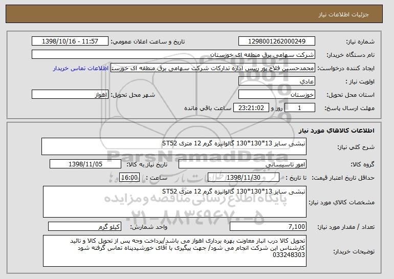 شرح کلی نیاز: نبشی سایز 13*130*130 گالوانیزه گرم 12 متری ST52