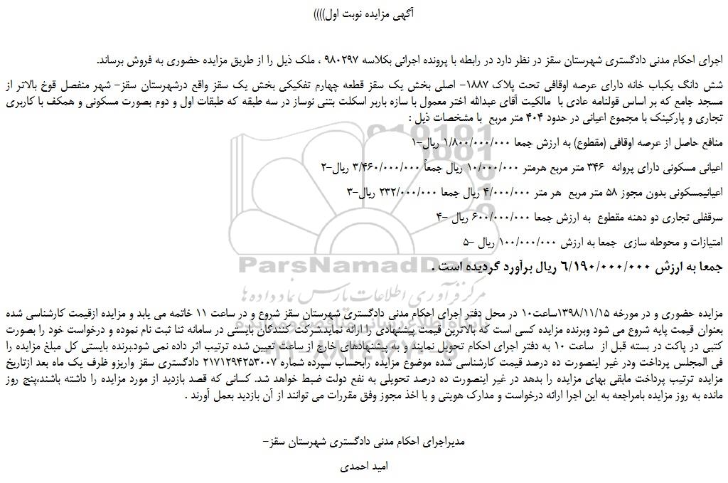 اجرای احکام مدنی دادگستری شهرستان سقز در نظر دارد در رابطه با پرونده اجرائی بکلاسه 980297 ، ملک ذیل را از طریق مزایده حضوری به فروش برساند.