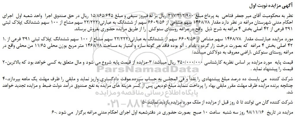 نظر به محکومیت آقای میر جعفر فتاحی به پرداخ مبلغ 317/312/900 ریال بر له فیروز سیفی و مبلغ 15/865/645 ریال در حق صندوق اجرا واحد شعبه اول اجرای احکام مدنی شهرستان مراغه در نظر دارد مقدار 1468/78 سهم مشاعی از 6609/56 سهم از ششدانگ به عبارتی(22/222 سهم مشاع از 100 سهم ششدانگ )پلاک ثبتی 391 فرعی از 42 اصلی بخش 4 مراغه به شرح ذیل واقع در مراغه روستای سنوکش را از طریق مزایده حضوری بفروش برساند.