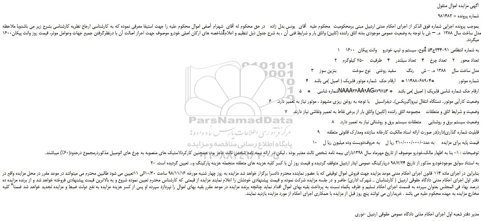 بموجب پرونده اجرایی شماره فوق الذکر از اجرای احکام مدنی اردبیل مبنی برمحکومیت محکوم علیه آقای یونس بدل زاده در حق محکوم له آقای شهرام آصفی اموال محکوم علیه را جهت استیفا معرفی نموده که به کارشناسی ارجاع نظریه کارشناسی بشرح زیر می باشدوبا ملاحظه شاخصه های ارکان اصلی خودرو موصوف جهت احراز اصالت آن با درنظرگرفتن جمیع جهات وعوامل موثر، قیمت روز وانت پیکان1600Iمدل ساخت سال 1388 هـ – ش با توجه به وضعیت عمومی موجودی بدنه اتاق راننده (کابین) واتاق بار و شرایطِ فنی آن ، به شرح جدول ذیل تنظیم و اعلام میگردد.
