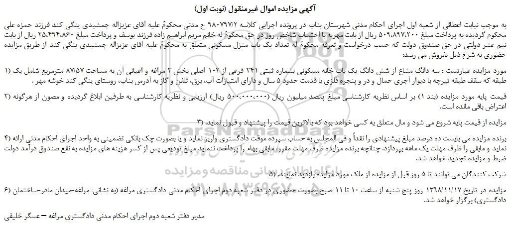 1) مورد مزایده عبارتست : سه دانگ مشاع از شش دانگ یک باب خانه مسکونی بشماره ثبتی 241 فرعی از 102 اصلی بخش 3 مراغه و اعیانی آن به مساحت 87/57 مترمربع شامل یک طبقه که سقف طبقه تیرچه با دیوار آجری حمال و در و پنجره فلزی با قدمت حدود 5 سال و دارای امتیازات آب، برق، تلفن و گاز به آدرس بناب، روستای ینگی کند خوشه مهر .