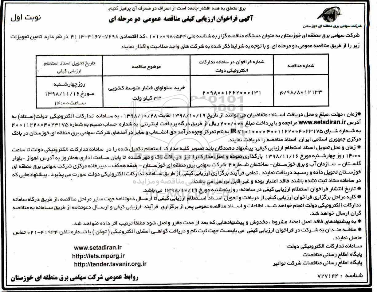 | م/98/8012133 | 2098001262000131 | خرید سلولهای فشار متوسط کشویی 33 کیلوولت |
