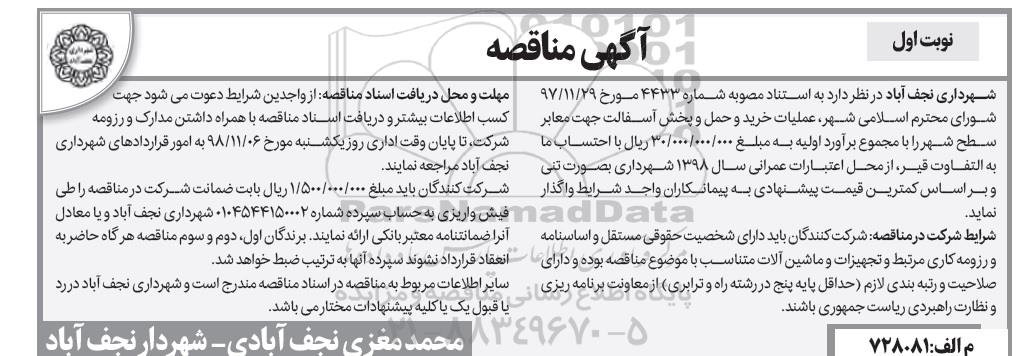 شهرداری نجف آباد در نظر دارد عملیات خرید و حمل و پخش آسفالت جهت معابر مناطق شهرداری نجف آباد را با مجموع برآورد اولیه به مبلغ 30.000.000.000 ریال با احتساب مابه التفاوت قبل از محل اعتبارات عمرانی سال 98 شهرداری بصورت تنی و براساس کمترین قیمت پیشنهادی به پیمانکاران واجد شرایط واگذار نماید.