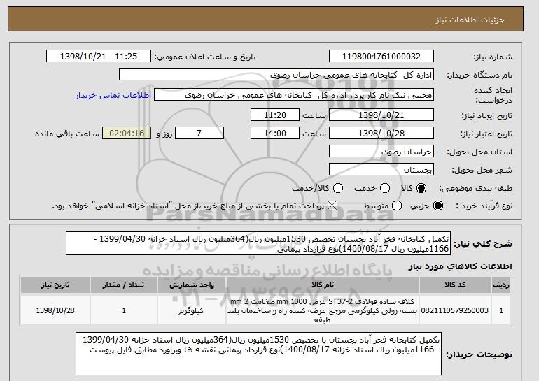 شرح کلی نیاز: تکمیل کتابخانه فخر آباد بجستان تخصیص 1530میلیون ریال(364میلیون ریال اسناد خزانه 1399/04/30 - 1166میلیون ریال 1400/08/17)نوع قرارداد پیمانی
