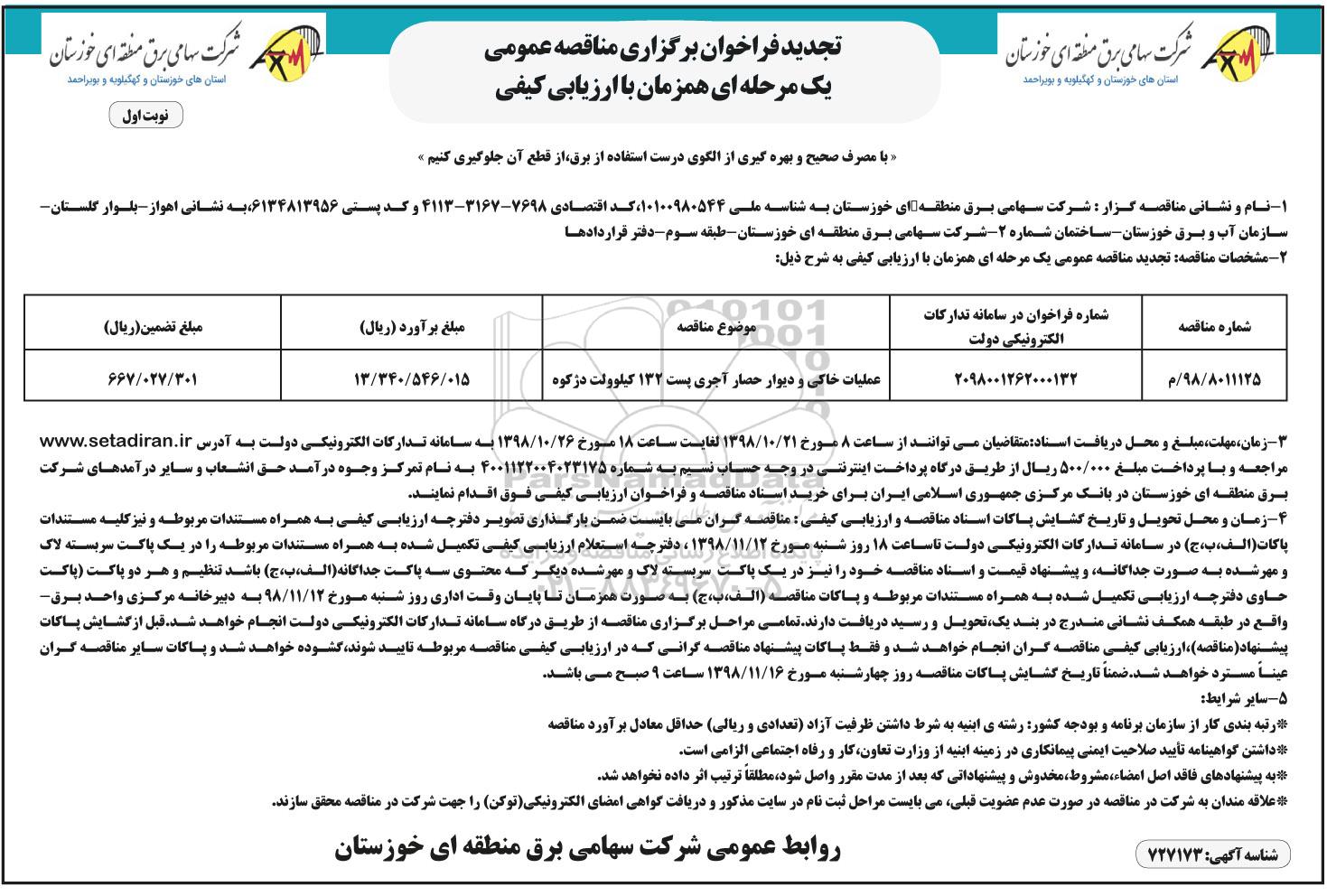 | 98/8011125/ م | 2098001262000132 | عملیات خاکی و دیوار حصار آجری پست 132 کیلووات دژکوه | 13.340.546.015 | 667.027.301 |