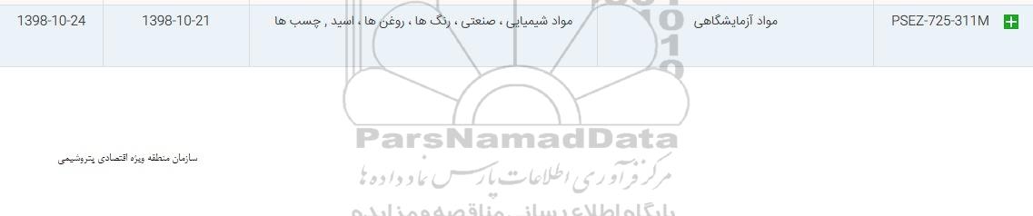 | PSEZ-725-311M | مواد آزمایشگاهی | مواد شیمیایی، صنعتی، رنگ ها، روغن ها، اسید، چسب ها | 98.10.24 |