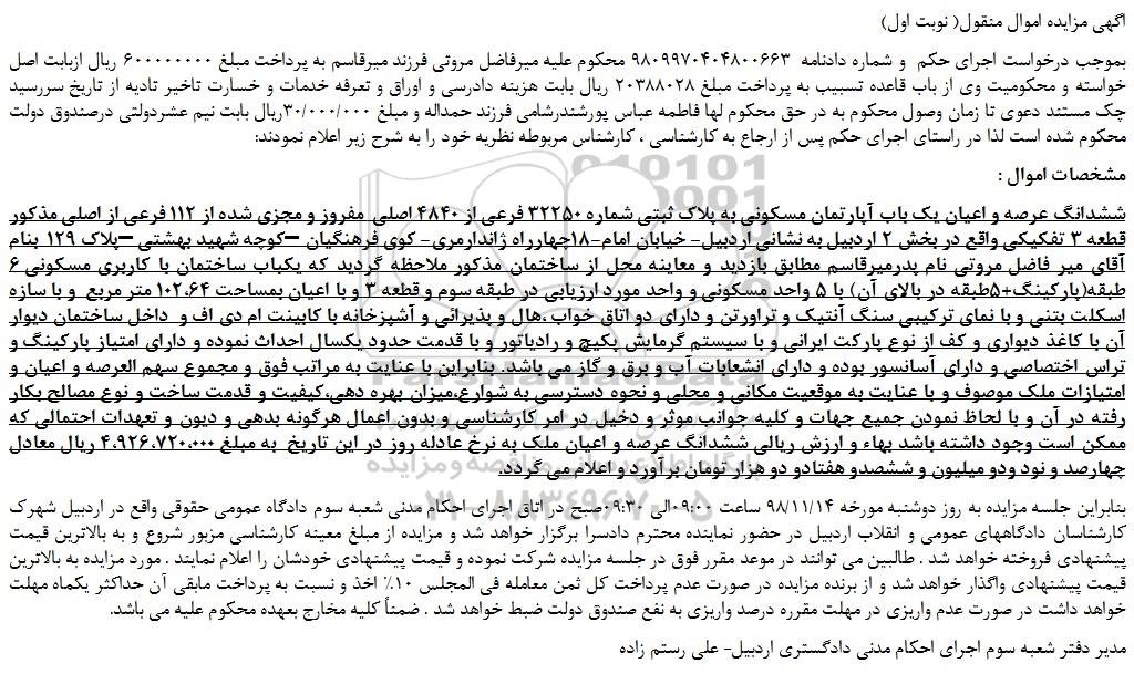بموجب درخواست اجرای حکم و شماره دادنامه 9809970404800663 محکوم علیه میرفاضل مروتی فرزند میرقاسم به پرداخت مبلغ 600000000 ریال ازبابت اصل خواسته و محکومیت وی از باب قاعده تسبیب به پرداخت مبلغ 20388028 ریال بابت هزینه دادرسی و اوراق و تعرفه خدمات و خسارت تاخیر تادیه از تاریخ سررسید چک مستند دعوی تا زمان وصول محکوم به در حق محکوم لها فاطمه عباس پورشندرشامی فرزند حمداله و مبلغ 30/000/000ریال بابت نیم عشردولتی درصندوق دولت محکوم شده است لذا در راستای اجرای حکم پس از ارجاع به کارشناسی ، کارشناس مربوطه نظریه خود را به شرح زیر اعلام نمودند:
