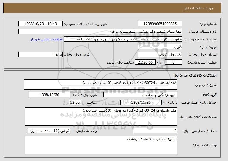 مشخصات کالای مورد نیاز: فیلم رادیولوزی 24*30(کداک-آکفا) دو قوطی (10بسته صد تایی)