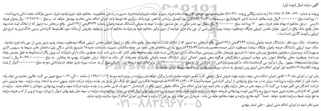 بنابر این در اجرای ماده 114 قانون اجرای احکام مدنی موعد مزایده جهت فروش اموال توقیفی که با حضور نماینده محترم دادسرا برگزار خواهد شد ، مزایده در روزدو شنبه مورخه 1398/11/14 از ساعت 10الی10/30 صبح تعیین می گردد. طالبین محترم می تواند یک ساعت قبل از انجام مزایده با پرداخت میزان ده در صد مبلغ پشنهادی از ارزش کارشناسی معینه به شماره 2171290841006 حساب سپرده دادگستری اردبیل نزد بانک ملی واریز ودر جلسه مزایده شرکت نمایند .بدیهی است به استثناء برنده مزایده ، وجه واریزی سایر شرکت کنندگان فی الفور عودت می گردد لذا در موعد مقرر در محل مزایده واقع در دفتر شعبه دوم اجرای احکام مدنی دادگاه حقوقی اردبیل واقع در کارشناسان – شهرک اداری حاضر و در جلسه مزایده شرکت نموده و قیمت پیشنهادی خودشان را اعلام نمایند . مزایده از قیمتی که کارشناس محترم تعیین نموده شروع و به بالاترین قیمت پیشنهادی فروخته خواهد شد .برنده مزایده ظرف یکماه نسبت به پرداخت بقیه بهای اموال اقدام می نماید . چنانچه برنده مزایده در موعد مقرر بقیه بهای اموال را نپردازد سپرده او پس از کسر هزینه مزایده به نفع دولت ضبط و مزایده تجدید خواهد . ضمنا" کلیه مخارج مزایده بر عهده محکوم علیه می باشد . خریداران می توانند پنج روز قبل از مزایده با همکاری اجرای احکام از مورد مزادیده بازدید نمایند.