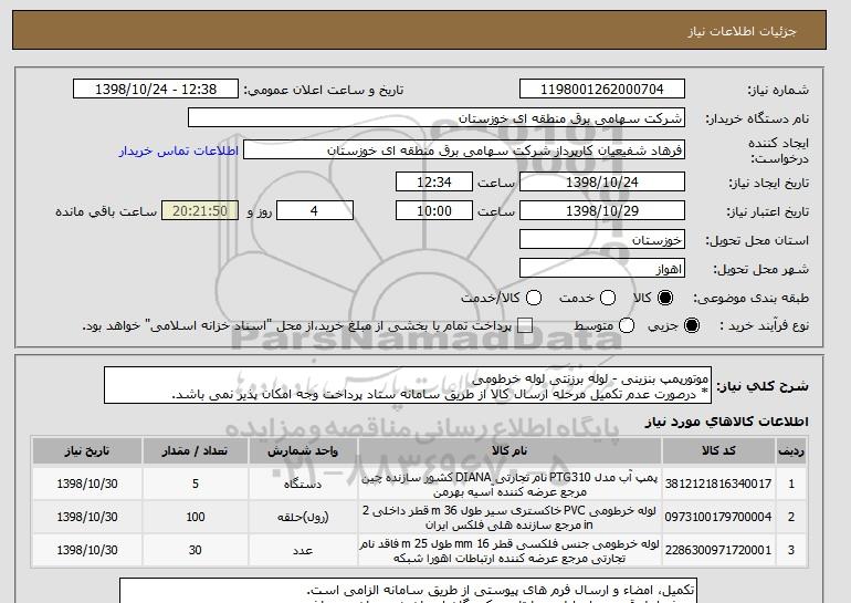 استعلام موتورپمپ بنزینی - لوله برزنتی لوله خرطومی * درصورت عدم تکمیل مرحله ارسال کالا از طریق سامانه ستاد پرداخت وجه امکان پذیر نمی باشد., استعلام موتورپمپ بنزینی - لوله برزنتی لوله خرطومی * درصورت عدم تکمیل مرحله ارسال کالا از طریق سامانه ستاد پرداخت وجه امکان پذیر نمی باشد.