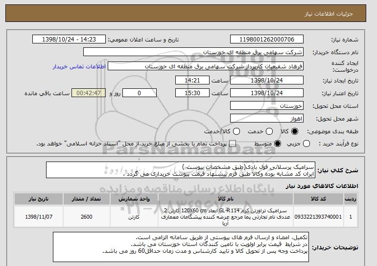 شرح کلی نیاز: سرامیک پرسلانی فول بادی(طبق مشخصات پیوست ) ایران کد مشابه بوده وکالا طبق فرم پیشنهاد قیمت پیوست خریداری می گردد .