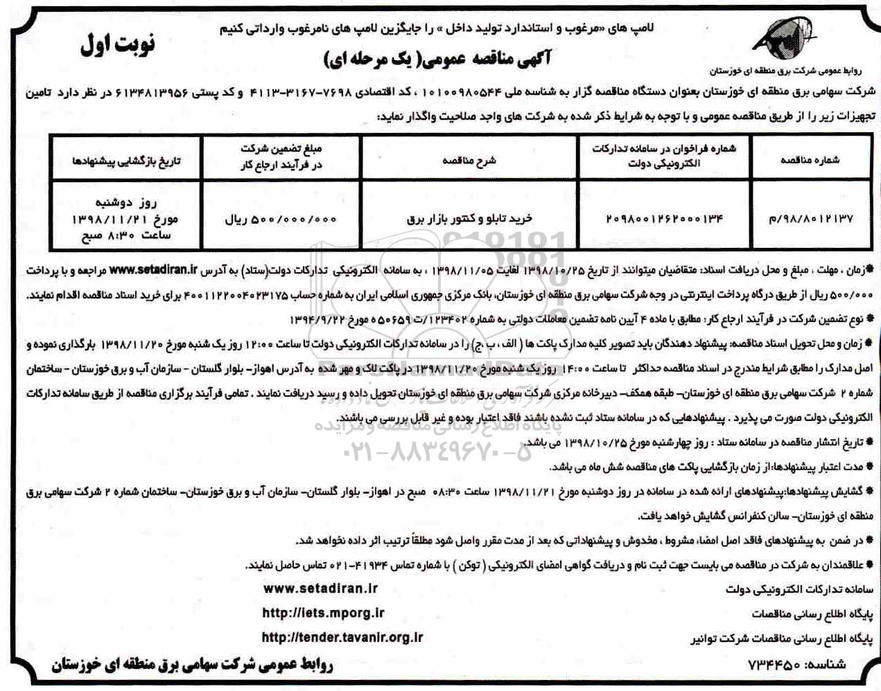 زمان و محل تحویل اسناد مناقصه : پیشنهاد دهندگان باید تصویر کلیه مدارک پاکت ها الف ـ ب ـ ج را در سامانه تدارکات الکترونیکی دولت تا ساعت 12 روز 1شنبه 98.11.20 بارگذاری نموده و اصل مدارک را مطابق شرایط مندرج در اسناد مناقصه حداکثر تا ساعت 14 روز یکشنبه مورخ 98.11.20 در پاکت لاک و مهر شده به آدرس اهواز بلوار گلستان سازمان آب و برق خوزستان ساختمان شماره 2 شرکت سهامی برق منطقه ای خوزستان طبقه همکف دبیرخانه مرکزی شرکت سهامی برق منطقه ای خوزستان تحویل داده و رسید دریافت نمایند.