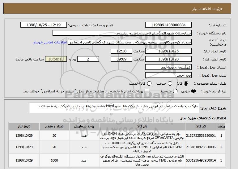 شرح کلی نیاز: مارک درخواست حتما باید ایرانی باشد.شرکت ها عضو imed باشد وهزینه ارسال با شرکت برنده میباشد