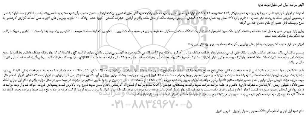 با در نظرگرفتن جهات دخیل درامرکارشناسی ازجمله موقعیت مکانی وزمانی،نوع مصالح بکاررفته،کیفیت ساخت و ساز،نوع کاربری وسایرعوامل موثر درامرارزیابی،ارزش سه دانگ مشاع ازشش دانگ عرصه واعیان ملک موصوف درموقعیت زمانی کارشناسی بدون درنظرگرفت دیون وسایرعوارضات محتمله نسبت به بانک ها ،ادارات وسایرنهادهای حقیقی وحقوقی جمعا به مبلغ 2/480/000/000ریال(دومیلیارد و چهارصد وهشتاد میلیون ریال) بر آورد وتقدیم حضورتان می گردد.بنابراین در اجرای ماده 114 قانون اجرای احکام مدنی موعد مزایده جهت فروش اموال توقیفی که با حضور نماینده محترم دادسرا برگزار خواهد شد مزایده به روز یک شنبه مورخه1398/11/20 از ساعت 10.30 الی 11تعیین می شود طالبین محترم می میتوانند در موعد مقرر در محل مزایده واقع در دفتر اول اجرای احکام مدنی دادگاه حقوقی اردبیل ( کارشناسان ـ شهرک اداری) حاضر و در جلسه مزایده شرکت نموده و قیمت پیشنهادی خودشان را اعلام نمایند مزایده از قیمتی که کارشناس محترم تعیین نموده شروع و به بالاترین قیمت پیشنهادی فروخته خواهد شد و از برنده مزایده ده درصد بهاء فی المجلس بعنوان سپرده به قسمت اجرای احکام تسلیم و ظرف یکماه نسبت به پرداخت بقیه بهای اموال اقدام نماید چنانچه برنده مزایده در موعد مقرر بقیه بهای اموال را نپردازد سپرده او پس از کسر هزینه مزایده به نفع دولت ضبط و مزایده تجدید خواهد شد ضمنا" کلیه مخارج مزایده به عهده محکوم علیه می باشد . خریداران می توانند پنج روز قبل از مزایده با همکاری اجرای احکام از مورد مزایده بازدید نمایند.