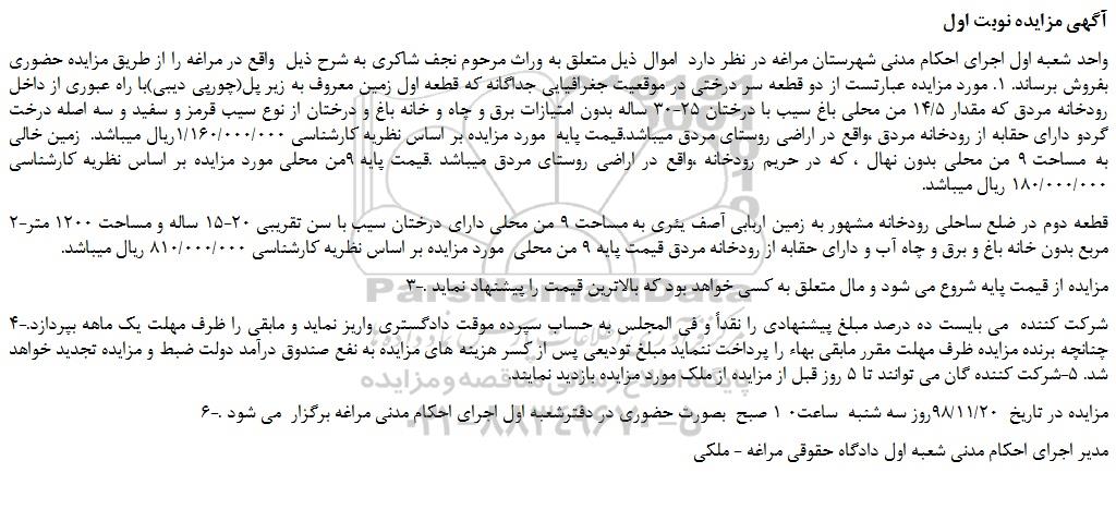 واحد شعبه اول اجرای احکام مدنی شهرستان مراغه در نظر دارد  اموال ذیل متعلق به وراث مرحوم نجف شاکری به شرح ذیل  واقع در مراغه را از طریق مزایده حضوری بفروش برساند. 1. مورد مزایده عبارتست از دو قطعه سر درختی در موقعیت جغرافیایی جداگانه که قطعه اول زمین معروف به زیر پل(چورپی دیبی)با راه عبوری از داخل رودخانه مردق که مقدار 14/5 من محلی باغ سیب با درختان 25-30 ساله بدون امتیازات برق و چاه و خانه باغ و درختان از نوع سیب قرمز و سفید و سه اصله درخت گردو دارای حقابه از رودخانه مردق ،واقع در اراضی روستای مردق میباشد.قیمت پایه  مورد مزایده بر اساس نظریه کارشناسی 1/160/000/000ریال میباشد.  زمین خالی به مساحت 9 من محلی بدون نهال ، که در حریم رودخانه ،واقع در اراضی روستای مردق میباشد .قیمت پایه 9من محلی مورد مزایده بر اساس نظریه کارشناسی 180/000/000 ریال میباشد.