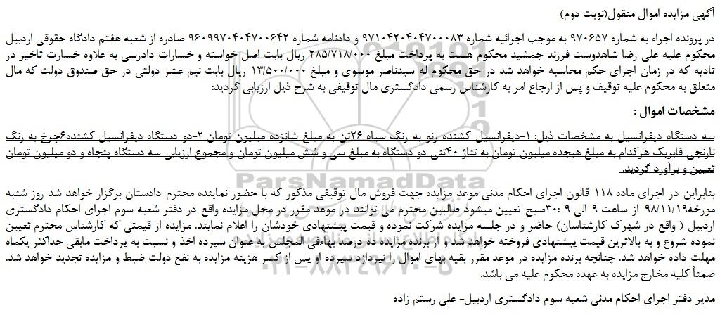 در پرونده اجراء به شماره 970657 به موجب اجرائیه شماره 9710420404700083 و دادنامه شماره 9609970404700642 صادره از شعبه هفتم دادگاه حقوقی اردبیل محکوم علیه علی رضا شاهدوست فرزند جمشید محکوم هست به پرداخت مبلغ 285/718/000 ریال بابت اصل خواسته و خسارات دادرسی به علاوه خسارت تاخیر در تادیه که در زمان اجرای حکم محاسبه خواهد شد در حق محکوم له سیدناصر موسوی و مبلغ 13/500/000 ریال بابت نیم عشر دولتی در حق صندوق دولت که مال متعلق به محکوم علیه توقیف و پس از ارجاع امر به کارشناس رسمی دادگستری مال توقیفی به شرح ذیل ارزیابی گردید: