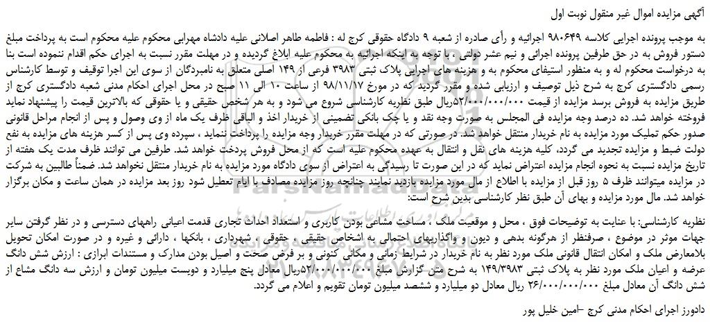 به موجب پرونده اجرایی کلاسه 980649 اجرائیه و رأی صادره از شعبه 9 دادگاه حقوقی کرج له : فاطمه طاهر اصلانی علیه دادشاه مهرابی محکوم علیه محکوم است به پرداخت مبلغ دستور فروش به در حق طرفین پرونده اجرائی و نیم عشر دولتی ، با توجه به اینکه اجرائیه به محکوم علیه ابلاغ گردیده و در مهلت مقرر نسبت به اجرای حکم اقدام ننموده است بنا به درخواست محکوم له و به منظور استیفای محکوم به و هزینه های اجرایی پلاک ثبتی 3983 فرعی از 149 اصلی متعلق به نامبردگان از سوی این اجرا توقیف و توسط کارشناس رسمی دادگستری کرج به شرح ذیل توصیف و ارزیابی شده و مقرر گردید که در مورخ 98/11/17 از ساعت 10 الی 11 صبح در محل اجرای احکام مدنی شعبه دادگستری کرج از طریق مزایده به فروش برسد مزایده از قیمت 52/000/000/000ریال طبق نظریه کارشناسی شروع می شود و به هر شخص حقیقی و یا حقوقی که بالاترین قیمت را پیشنهاد نماید فروخته خواهد شد. ده درصد وجه مزایده فی المجلس به صورت وجه نقد و یا چک بانکی تضمینی از خریدار اخذ و الباقی ظرف یک ماه از وی وصول و پس از انجام مراحل قانونی صدور حکم تملیک مورد مزایده به نام خریدار منتقل خواهد شد. در صورتی که در مهلت مقرر خریدار وجه مزایده را پرداخت ننماید ، سپرده وی پس از کسر هزینه های مزایده به نفع دولت ضبط و مزایده تجدید می گردد، کلیه هزینه های نقل و انتقال به عهده محکوم علیه است که از محل فروش پردخت خواهد شد. طرفین می توانند ظرف مدت یک هفته از تاریخ مزایده نسبت به نحوه انجام مزایده اعتراض نماید که در این صورت تا رسیدگی به اعتراض از سوی دادگاه مورد مزایده به نام خریدار منتقل نخواهد شد. ضمناً طالبین به شرکت در مزایده میتوانند ظرف 5 روز قبل از مزایده با اطلاع از مال مورد مزایده بازدید نمایند چنانچه روز مزایده مصادف با ایام تعطیل شود روز بعد مزایده در همان ساعت و مکان برگزار خواهد شد. مال مورد مزایده و بهای آن طبق نظر کارشناسی بدین شرح است: