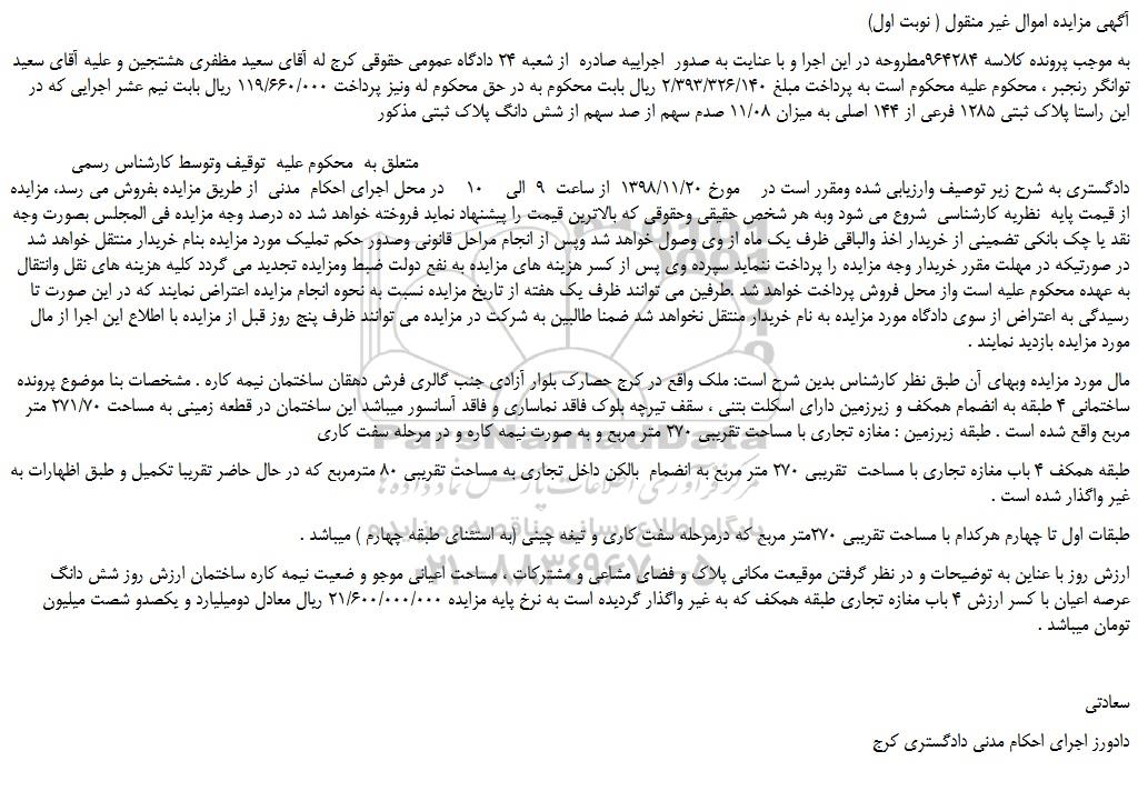 به موجب پرونده کلاسه 964284مطروحه در این اجرا و با عنایت به صدور  اجراییه صادره  از شعبه 24 دادگاه عمومی حقوقی کرج له آقای سعید مظفری هشتجین و علیه آقای سعید توانگر رنجبر ، محکوم علیه محکوم است به پرداخت مبلغ 2/393/326/140 ریال بابت محکوم به در حق محکوم له ونیز پرداخت 119/660/000 ریال بابت نیم عشر اجرایی که در این راستا پلاک ثبتی 1285 فرعی از 144 اصلی به میزان 11/08 صدم سهم از صد سهم از شش دانگ پلاک ثبتی مذکور                                                                                                                                                                                                                                                                                                                                                                                                           متعلق به  محکوم علیه  توقیف وتوسط کارشناس رسمی دادگستری به شرح زیر توصیف وارزیابی شده ومقرر است در    مورخ 1398/11/20  از ساعت  9  الی    10    در محل اجرای احکام  مدنی  از طریق مزایده بفروش می رسد، مزایده از قیمت پایه  نظریه کارشناسی  شروع می شود وبه هر شخص حقیقی وحقوقی که بالاترین قیمت را پیشنهاد نماید فروخته خواهد شد ده درصد وجه مزایده فی المجلس بصورت وجه نقد یا چک بانکی تضمینی از خریدار اخذ والباقی ظرف یک ماه از وی وصول خواهد شد وپس از انجام مراحل قانونی وصدور حکم تملیک مورد مزایده بنام خریدار منتقل خواهد شد در صورتیکه در مهلت مقرر خریدار وجه مزایده را پرداخت ننماید سپرده وی پس از کسر هزینه های مزایده به نفع دولت ضبط ومزایده تجدید می گردد کلیه هزینه های نقل وانتقال به عهده محکوم علیه است واز محل فروش پرداخت خواهد شد .طرفین می توانند ظرف یک هفته از تاریخ مزایده نسبت به نحوه انجام مزایده اعتراض نمایند که در این صورت تا رسیدگی به اعتراض از سوی دادگاه مورد مزایده به نام خریدار منتقل نخواهد شد ضمنا طالبین به شرکت در مزایده می توانند ظرف پنج روز قبل از مزایده با اطلاع این اجرا از مال مورد مزایده بازدید نمایند .