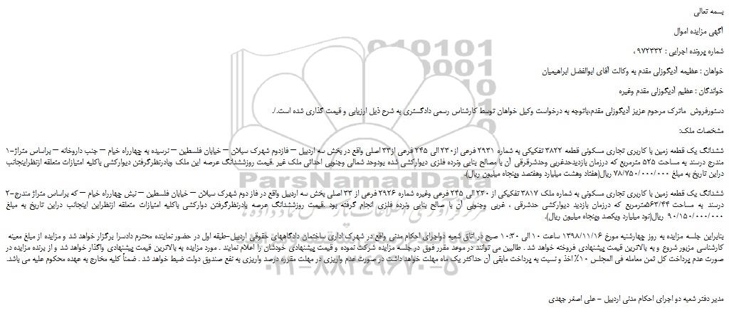 1-ششدانگ یک قطعه زمین با کاربری تجاری مسکونی قطعه 3822 تفکیکی به شماره 2931 فرعی از230 الی 245 فرعی از33 اصلی واقع در بخش سه اردبیل – فازدوم شهرک سبلان – خیابان فلسطین – نرسیده به چهارراه خیام – جنب داروخانه – براساس متراژ مندرج درسند به مساحت 525 مترمربع که درزمان بازدیدحدغربی وحدشرقرقی آن با مصالح بنایی ونرده فلزی دیوارکشی شده بودوحد شمالی وجنوبی احداثی ملک غیر .قیمت روزششدانگ عرصه این ملک وبادرنظرگرفتن دیوارکشی باکلیه امتیازات متعلقه ازنظراینجانب دراین تاریخ به مبلغ 78/750/000/000 ریال(هفتاد وهشت میلیارد وهفتصد وپنجاه میلیون ریال).