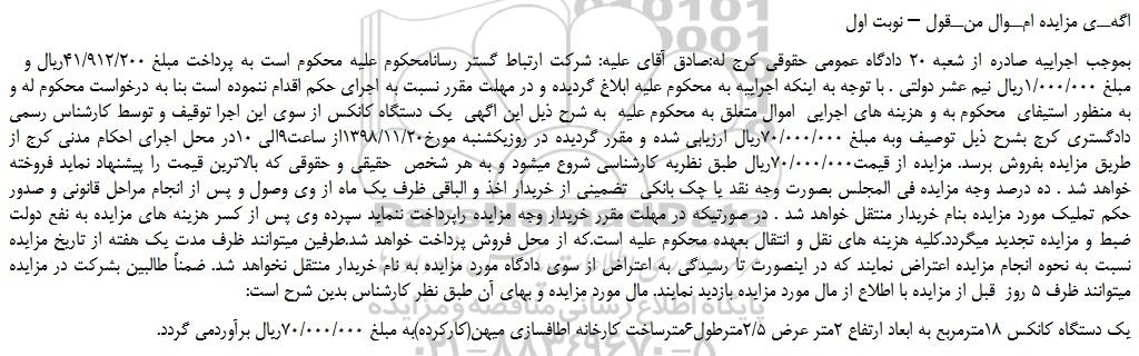 بموجب اجراییه صادره از شعبه 20 دادگاه عمومی حقوقی کرج له:صادق آقای علیه: شرکت ارتباط گستر رسانامحکوم علیه محکوم است به پرداخت مبلغ 41/912/200ریال و مبلغ 1/000/000ریال نیم عشر دولتی . با توجه به اینکه اجراییه به محکوم علیه ابلاغ گردیده و در مهلت مقرر نسبت به اجرای حکم اقدام ننموده است بنا به درخواست محکوم له و به منظور استیفای محکوم به و هزینه های اجرایی اموال متعلق به محکوم علیه به شرح ذیل این اگهی یک دستگاه کانکس از سوی این اجرا توقیف و توسط کارشناس رسمی دادگستری کرج بشرح ذیل توصیف وبه مبلغ 70/000/000ریال ارزیابی شده و مقرر گردیده در روزیکشنبه مورخ1398/11/20از ساعت9الی 10در محل اجرای احکام مدنی کرج از طریق مزایده بفروش برسد. مزایده از قیمت70/000/000ریال طبق نظریه کارشناسی شروع میشود و به هر شخص حقیقی و حقوقی که بالاترین قیمت را پیشنهاد نماید فروخته خواهد شد . ده درصد وجه مزایده فی المجلس بصورت وجه نقد یا چک بانکی تضمینی از خریدار اخذ و الباقی ظرف یک ماه از وی وصول و پس از انجام مراحل قانونی و صدور حکم تملیک مورد مزایده بنام خریدار منتقل خواهد شد . در صورتیکه در مهلت مقرر خریدار وجه مزایده راپرداخت ننماید سپرده وی پس از کسر هزینه های مزایده به نفع دولت ضبط و مزایده تجدید میگردد.کلیه هزینه های نقل و انتقال بعهده محکوم علیه است.که از محل فروش پرداخت خواهد شد.طرفین میتوانند ظرف مدت یک هفته از تاریخ مزایده نسبت به نحوه انجام مزایده اعتراض نمایند که در اینصورت تا رسیدگی به اعتراض از سوی دادگاه مورد مزایده به نام خریدار منتقل نخواهد شد. ضمناً طالبین بشرکت در مزایده میتوانند ظرف 5 روز قبل از مزایده با اطلاع از مال مورد مزایده بازدید نمایند. مال مورد مزایده و بهای آن طبق نظر کارشناس بدین شرح است: