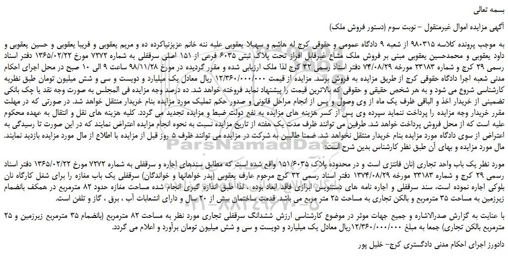 به موجب پرونده کلاسه 980315 از شعبه 9 دادگاه عمومی و حقوقی کرج له هاشم و سهیلا یعقوبی علیه ننه خانم عزیزنیاکرده ده و مریم یعقوبی و فریبا یعقوبی و حسین یعقوبی و داود یعقوبی و محمدحسین یعقوبی مبنی بر فروش ملک مشاع غیرقابل افراز تحت پلاک ثبتی 6035 فرعی از 151 اصلی سرقفلی به شماره 7272 مورخ 1365/02/22 دفتر اسناد رسمی 29 کرج و شماره 23183 مورخه 74/08/29 دفتر اسناد رسمی 32 کرج لذا ملک ارزیابی شده و مقرر گردیده در مورخ 98/11/28 ساعت 9 الی 10 صبح در محل اجرای احکام مدنی شعبه اجرا دادگاه حقوقی کرج از طریق مزایده به فروش برسد. مزایده از قیمت 12/360/000/000 ریال معادل یک میلیارد و دویست و سی و شش میلیون تومان طبق نظریه کارشناسی شروع می شود و به هر شخص حقیقی و حقوقی که بالاترین قیمت را پیشنهاد نماید فروخته خواهد شد. ده درصد وجه مزایده فی المجلس به صورت وجه نقد یا چک بانکی تضمینی از خریدار اخذ و الباقی ظرف یک ماه از وی وصول و پس از انجام مراحل قانونی و صدور حکم تملیک مورد مزایده بنام خریدار منتقل خواهد شد. در صورتی که در مهلت مقرر خریدار وجه مزایده را پرداخت ننماید سپرده وی پس از کسر هزینه های مزایده به نفع دولت ضبط و مزایده تجدید می گردد. کلیه هزینه های نقل و انتقال به عهده محکوم علیه است که از محل فروش پرداخت خواهد شد. طرفین می توانند ظرف مدت یک هفته از تاریخ مزایده نسبت به نحوه انجام مزایده اعتراض نمایند که در این صورت تا رسیدگی به اعتراض از سوی دادگاه مورد مزایده بنام خریدار منتقل نخواهد شد. ضمنا طالبین به شرکت در مزایده می توانند ظرف 5 روز قبل از مزایده با اطلاع از مال مورد مزایده بازدید نمایند. مال مورد مزایده و بهای آن طبق نظر کارشناس بدین شرح است: