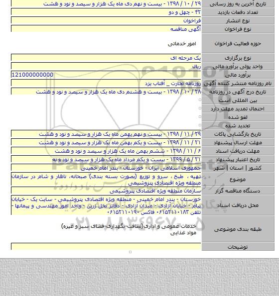 تهیه ٬ طبخ ٬ سرو و توزیع (بصورت بسته بندی) صبحانه٬ ناهار و شام در سازمان منطقه ویژه اقتصادی پتروشیمی