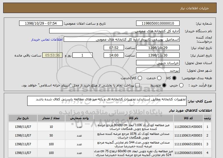 شرح کلی نیاز: تجهیزات کتابخانه مطابق استاندارد تجهیزات کتابخانه ای و پایه میز های مطالعه بایستی کلاف شده باشد