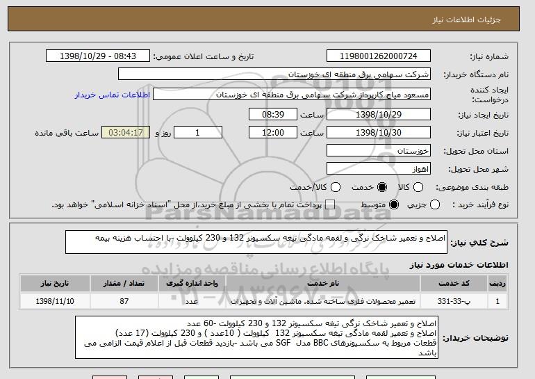 شرح کلی نیاز: اصلاح و تعمیر شاخک نرگی و لقمه مادگی تیغه سکسیونر 132 و 230 کیلوولت -با احتساب هزینه بیمه