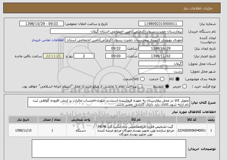شرح کلی نیاز: تحویل کالا در محل بیمارستان به عهده فروشنده است.در صورت احتساب مالیات بر ارزش افزوده گواهی ثبت نام ارایه شود.کالای باید دارای گارانتی معتبر باشد.