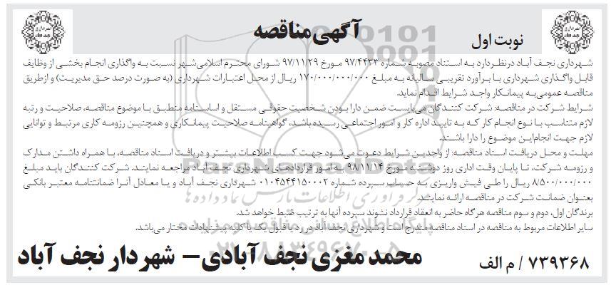 شهرداری نجف آباد در نظر دارد نسبت به واگذاری انجام بخشی از وظایف قابل واگذاری شهرداری با برآورد تقریبی سالیانه به مبلغ 170.000.000 ریال از محل اعتبارات شهرداری به صورت درصد حق مدیریت و از طریق مناقصه عمومی به پیمانکار واجد شرایط اقدام نماید