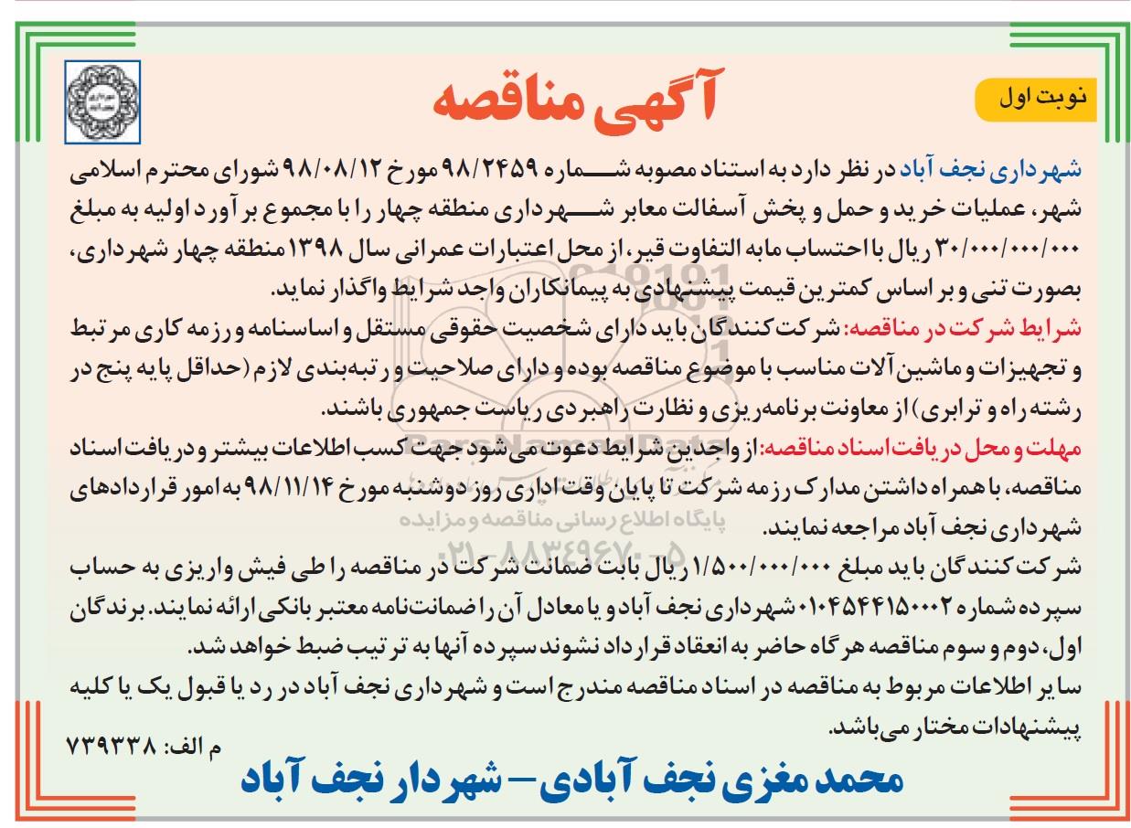 شهرداری نجف آباد در نظر دارد عملیات خرید و حمل و پخش آسفالت معابر شهرداری منطقه چهار را با مجموع برآورد اولیه به مبلغ 30.000.000.000 ریال با احتساب مابه التفاوت قیر، از محل اعتبارات عمرانی سال 98 منطقه چهار شهرداری بصورت تنی و براساس کمترین قیمت پیشنهادی به پیمانکاران واجد شرایط واگذار نماید.
