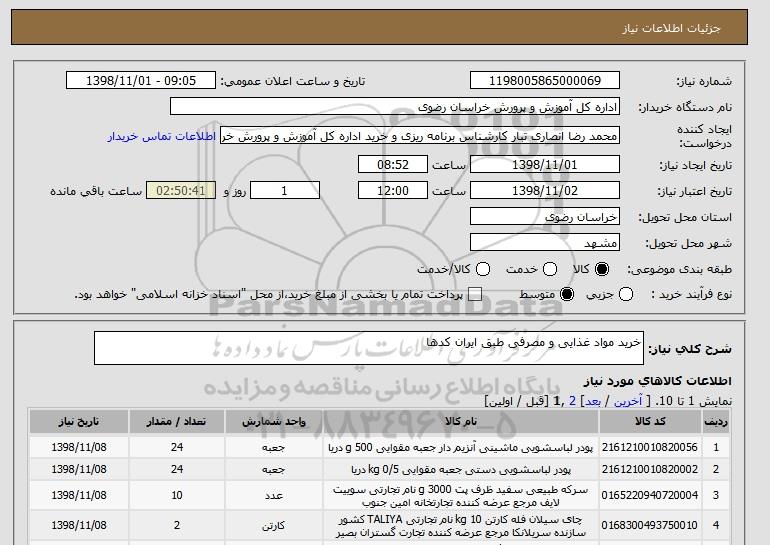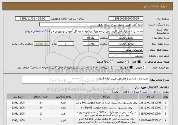 شرح کلی نیاز: خرید مواد غذایی و مصرفی طبق ایران کدها