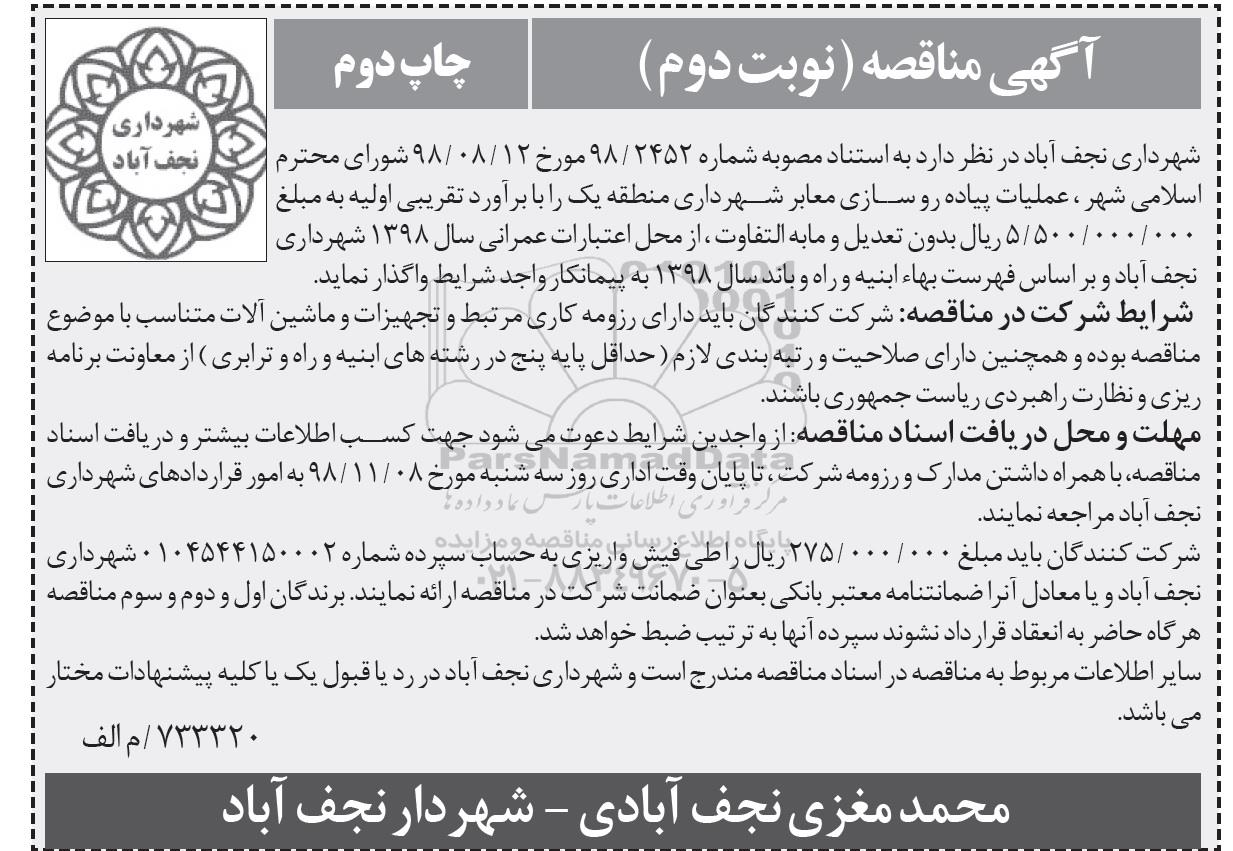 شهرداری نجف آباد در نظر دارد عملیات پیاده روسازی معابر شهرداری منطقه یک را با برآورد تقریبی اولیه به مبلغ 5.500.000.000 ریال بدون تعدیل و مابه التفاوت از محل اعتبارات عمرانی سال 1398 شهرداری نجف آباد و براساس فهرست بها ابنیه و راه و باندسال 1398 به پیمانکار واجد شرایط واگذار نماید.