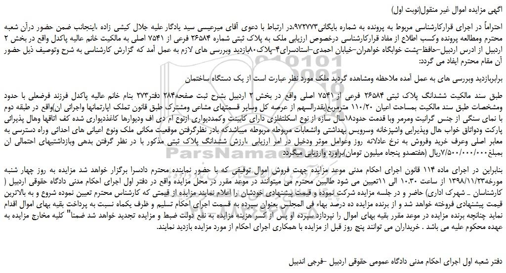 طبق سند مالکیت ششدانگ پلاک ثبتی 26584 فرعی از 7541 اصلی واقع در بخش 2 اردبیل بشرح ثبت صفحه284 دفتر273 بنام خانم عالیه پاکدل فرزند فرضعلی با حدود ومشخصات طبق سند مالکیت بمساحت اعیان 110/20 مترمربع(بقدرالسهم از عرصه کل وسایر قسمتهای مشاعی ومشترک طبق قانون تملک اپارتمانها واجرائی ان)واقع در طبقه دوم با نمای سنگی از جنس گرانیت ومرمر وبا قدمت حدود18سال سازه از نوع اسکلتفلزی دارای کابینت وکمددیواری ازنوع ام دی اف ودیوارها کاغذدیواری شده کف اتاقها وهال پذیرائی پارکت ودواتاق خواب هال وپذیرایی واشپزخانه وسرویس بهداشتی وانشعابات مربوطه مربوطه میباشدکه بادر نظرگرفتن موقعیت مکانی ملک ونوع اعیانی های احداثی وراه دسترسی به معابر اصلی وعرف خرید وفروش به نرخ عادلانه روز وعوامل موثر ودخیل در امر ارزیابی ،ارزش ششدانگ پلاک ثبتی مذکور با در نظر گرفتن بدهی وبازداشتیهای احتمالی ان بمبلغ7/500/000/000ریال (هفتصدو پنجاه میلیون تومان)براورد وارزیابی میگردد
