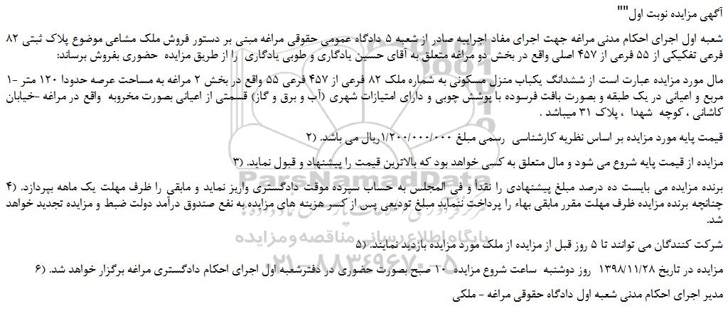 شعبه اول اجرای احکام مدنی مراغه جهت اجرای مفاد اجراییه صادر از شعبه 5 دادگاه عمومی حقوقی مراغه مبنی بر دستور فروش ملک مشاعی موضوع پلاک ثبتی 82 فرعی تفکیکی از 55 فرعی از 457 اصلی واقع در بخش دو مراغه متعلق به آقای حسین یادگاری و طوبی یادگاری را از طریق مزایده حضوری بفروش برساند:
