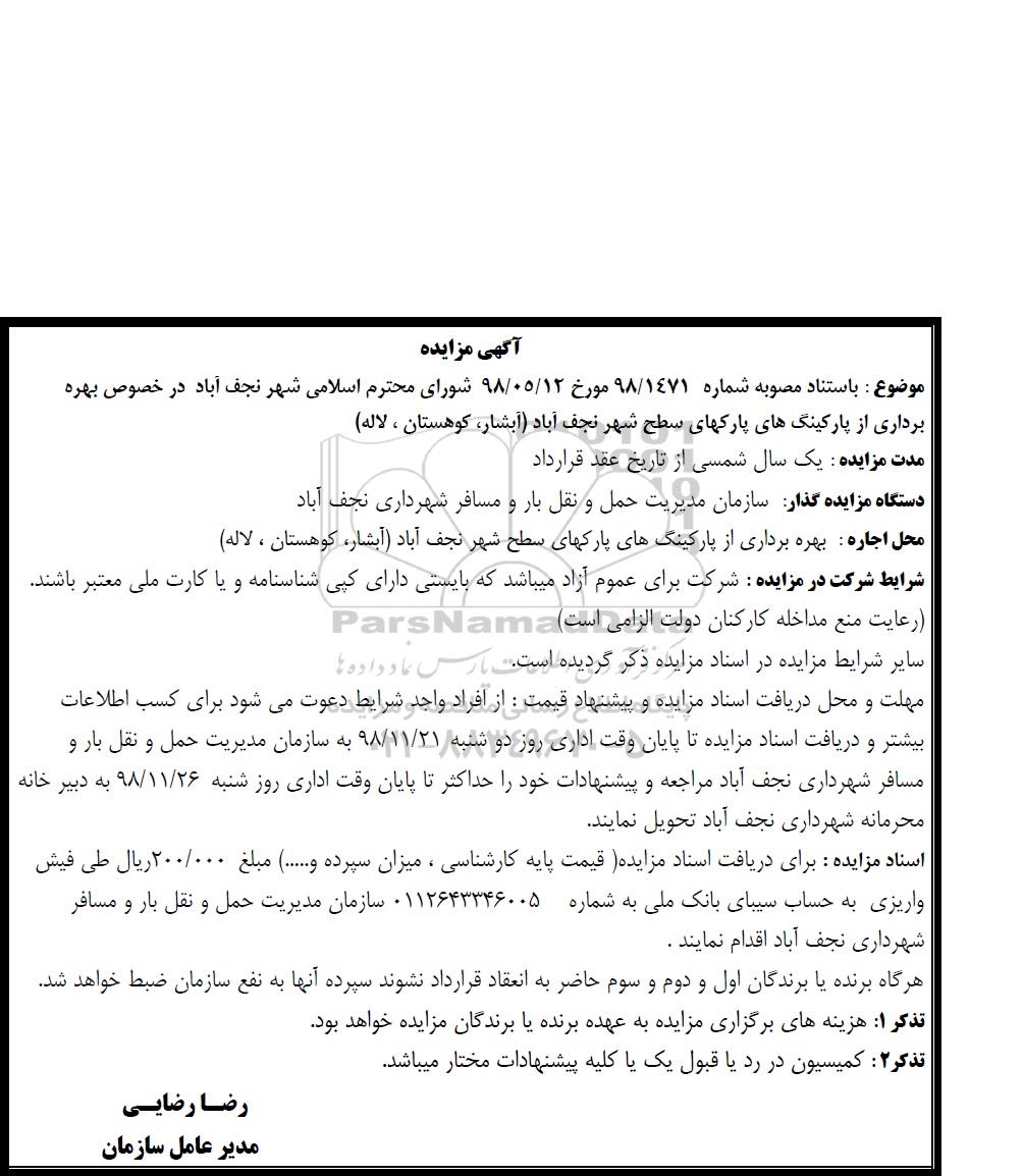 محل اجاره: بهره برداری از پارکینگهای پارکهای سطح شهر نجف اباد (آبشار ، کوهستان ، لاله)