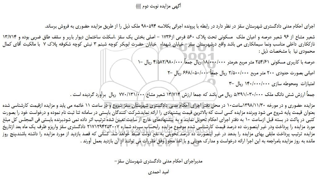 اجرای احکام مدنی دادگستری شهرستان سقز در نظر دارد در رابطه با پرونده اجرائی بکلاسه 980594 ملک ذیل را از طریق مزایده حضوری به فروش برساند.