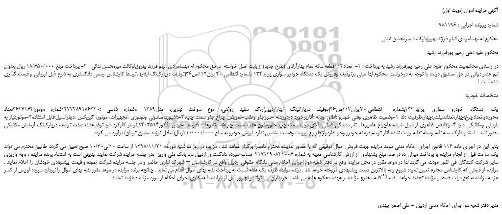 یک دستگاه خودرو سواری پراید 132بشماره انتظامی 20ایران112ص36(توقیف درپارکینگ ایثاراردبیل)رنگ سفید روغنی، نوع سوخت :بنزین، مدل1389 ،،شماره شاسی :1422289186320شماره موتور:3647164تعداد محور:دو،تعدادچرخ:چهار،تعدادسیلندر:چهار،ظرفیت :5، 1-وضعیت ظاهری وفنی خودرو :اطاق وبدنه :آثاربرخورد دردوربدنه -سپرجلو وعقب-تعویض چراغ جلو سمت چپ،2-داشبورد،صندولی وتودوزی ،تجهیزات، موتور، گیربکس ،دیفرانسیل:قابل استفاده3-موتور:نیاز به بازبینی ومکانیکی دارد 4-ونقایص ظاهری از قبیل شیشه هاچراغ هاسپرها ...تاب دیدگی کمانی بالای درب سمت چپ جلووستون عقب سمت چپ5- ،تایرها :50درصد ،خودرو مذکور203594کیلومتر کارکرد دارد.توضیحات :بعلت توقیف درپارکینگ آزمایش مکانیکی مقدور نشد -اسنادومدارک بیمه نامه وسیله نقلیه رویت نشده آثار ترمیم دربدنه خودرو وجود داردوازنظر رخ ورویت وضعیت مناسبی ندارد. ارزش خودرو به مبلغ 190/000/000ریال(معادل نوزده میلیون تومان) برآورد می گردد.