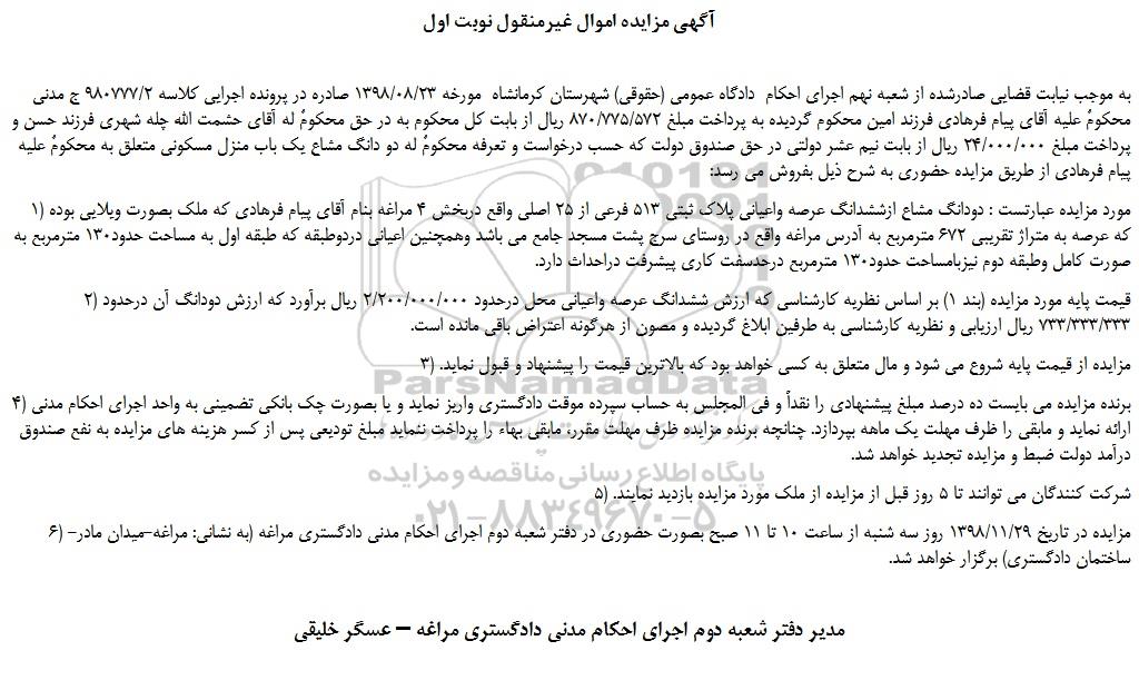 به موجب نیابت قضایی صادرشده از شعبه نهم اجرای احکام دادگاه عمومی (حقوقی) شهرستان کرمانشاه مورخه 1398/08/23 صادره در پرونده اجرایی کلاسه 980777/2 ج مدنی محکومٌ علیه آقای پیام فرهادی فرزند امین محکوم گردیده به پرداخت مبلغ 870/775/572 ریال از بابت کل محکوم به در حق محکومٌ له آقای حشمت الله چله شهری فرزند حسن و پرداخت مبلغ 24/000/000 ریال از بابت نیم عشر دولتی در حق صندوق دولت که حسب درخواست و تعرفه محکومٌ له دو دانگ مشاع یک باب منزل مسکونی متعلق به محکومٌ علیه پیام فرهادی از طریق مزایده حضوری به شرح ذیل بفروش می رسد: