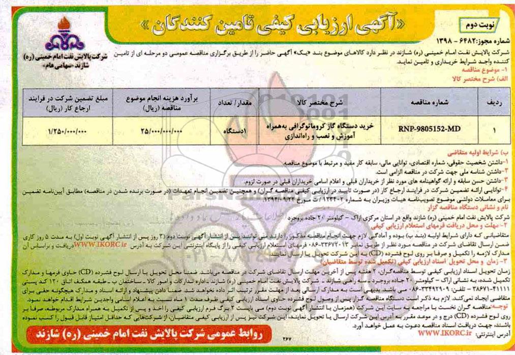 ارزیابی کیفی خرید دستگاه گاز کروماتوگرافی - نوبت دوم از کلیه افراد متخصص و شرکتها واجد شرایط دعوت به عمل میآید در مناقصه با کد خبرگزاری پارس نماد: 2168290 شرکت نمایند.