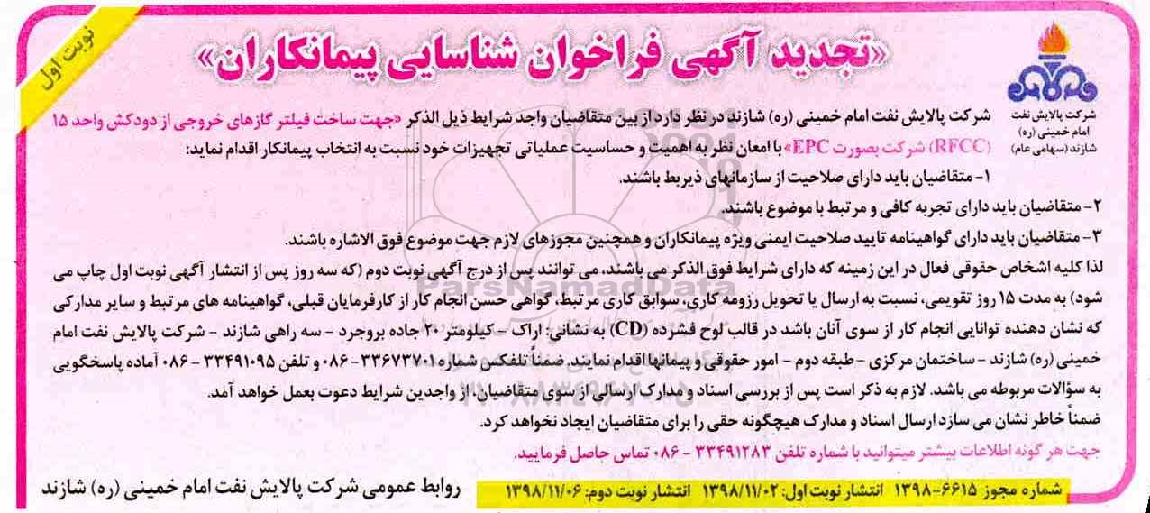 لذا کلیه اشخاص حقوقی فعال در این زمینه که دارای شرایط فوق الذکر می باشند، می توانند پس از درج آگهی نوبت دوم (که سه روز پس از انتشار آگهی نوبت اول چاپ می شود) به مدت 15 روز تقویمی ، نسبت به ارسال با تحویل رزومه کاری ، سوابق کاری مرتبط ، گواهی حسن انجام کار از کارفرمایان قبلی ، گواهینامه های مرتبط و سایر مدارکی که نشان دهنده توانایی انجام کار از سوی آنان باشد در قالب لوح فشرده(CD) به نشانی: اراک۔ کیلومتر 20 جاده بروجرد- سه راهی شازند. شرکت پالایش نفت امام خمینی (ره) شازند - ساختمان مرکزی- طبقه دوم - امور حقوقی و پیمانها اقدام نمایند. ضمنا تلفکس شماره 33673701-06 و تلفن 33491095-086 آماده پاسخگوئی به سؤالات مربوطه می باشد. لازم به ذکر است پس از بررسی اسناد و مدارک ارسالی از سوی متقاضیان، از واجدین شرایط دعوت بعمل خواهد آمد.