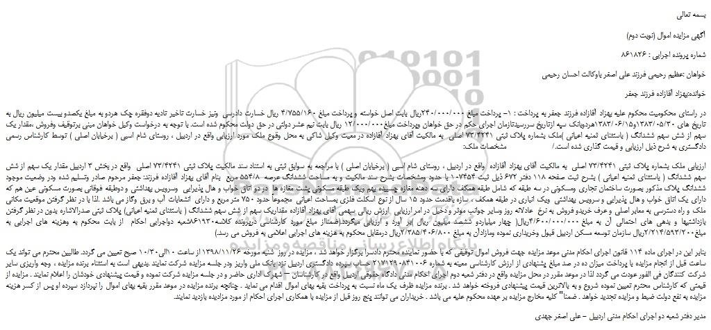 شعبه صادر کننده:شعبه دوم اجرای احکام مدنی دادگستری شهرستان اردبیل/قدیم