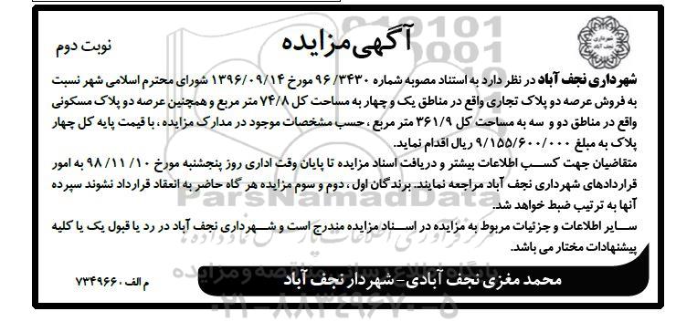 مزایده عمومی مزایده فروش دو پلاک تجاری نوبت دوم برگزار میگردد. از کلیه افراد متخصص و شرکتهای واجد شرایط دعوت به عمل میآید تا در این مزایده با کد خبرگزاری پارس نماد : 2169590 شرکت نمایند تاریخ شروع مزایده : 1398/11/02 مهلت شرکت در مزایده: تا پایان روز 1398/11/10 مکان برگزاری اموال واگذاری استانهای اصفهان و دستهبندیهای مربوط به این حراجی املاک و زمین میباشد.