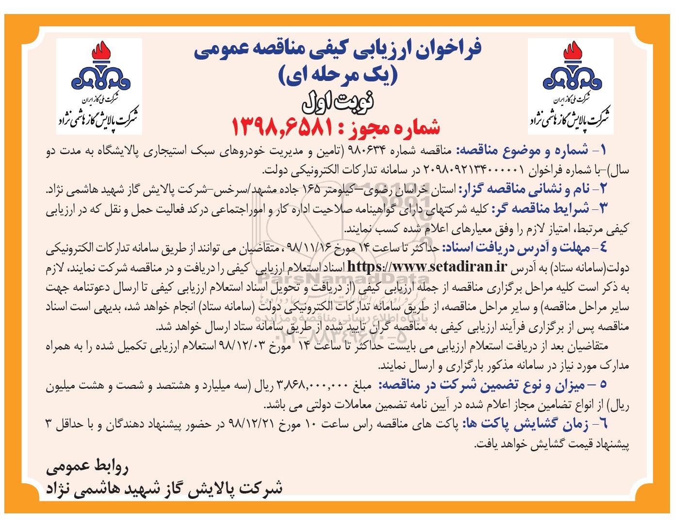 1-شماره و موضوع مناقصه: مناقصه شماره 980634 (تامین و مدیریت خودروهای سبک استیجاری پالایشگاه به مدت دو سال)- با شماره فراخوان 2098092134000001 در سامانه تدارکات الکترونیکی دولت