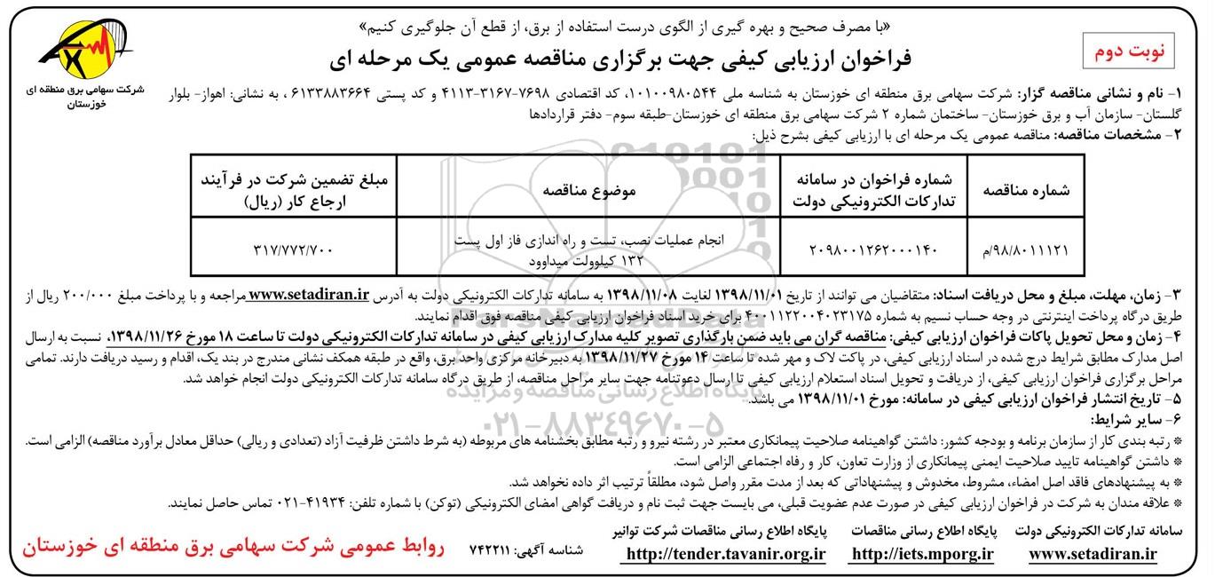 | 98/8011121/ م | 2098001262000140 | انجام عملیات نصب ، تست و راه اندازی فاز اول پست 132 کیلوولت میداوود | 317.772.700 |