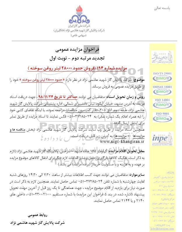 موضوع: شركت پالایش گاز شهید هاشمی نژاد در نظر دارد (حدود 28000 لیتر روغن سوخته) خود را از طریق مزایده عمومی به فروش برساند.
