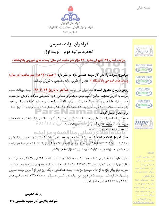 موضوع: شركت پالایش گاز شهید هاشمی نژاد در نظر دارد حدود 230 هزار متر مکعب در سال پساب های خروجی پالایشگاه خود را از طریق مزایده عمومی به فروش برساند
