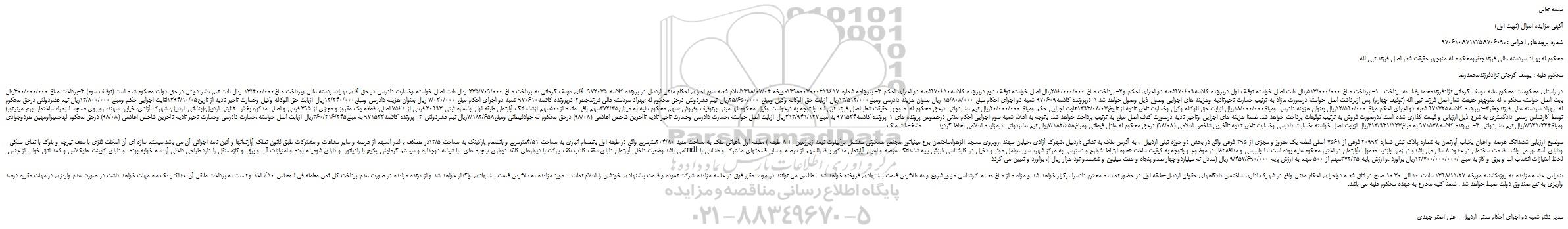 در راستای محکومیت محکوم علیه یوسف گرجانی نژادفرزندمحمدرضا به پرداخت : 1- پرداخت مبلغ 513/000/000ریال بابت اصل خواسته توقیف اول درپرونده کلاسه970609شعبه دو اجرای احکام و2- پرداخت مبلغ 256/000/000ریال اصل خواسته توقیف دوم درپرونده کلاسه970610شعبه دو اجرای احکام 3- پیرونامه شماره 1398007000419617مورخه 1398/07/04اعلام شعبه سوم اجرای احکام مدنی اردبیل در پرونده کلاسه 972075 آقای یوسف گرجانی به پرداخت مبلغ 235/709/000 ریال بابت اصل خواسته وخسارت دادرسی در حق آقای بهرادسردسته عالی وپرداخت مبلغ13/400/000 ریال بابت نیم عشر دولتی در حق دولت محکوم شده است.(توقیف سوم) 4-پرداخت مبلغ 400/000/000ریال بابت اصل خواسته محکو م له منوچهر حقیقت شعار اصل فرزند نبی اله (توقیف چهارم) پس ازبرداشت اصل خواسته درصورت مازاد به ترتیب خسارت تاخیرتادیه وهزینه های اجرایی وصول ذیل وصول خواهد شد.1-درپرونده کلاسه970609 شعبه دو اجرای احکام مبلغ 15/808/000 ریال بعنوان هزینه دادرسی ومبلغ13/512/000ریال ازبابت حق الوکاله وکیل ومبلغ 25/650/000ریال نیم عشردولتی درحق محکوم له :بهراد سردسته عالی فرزندجعفر2-درپرونده کلاسه970610 شعبه دو اجرای احکام مبلغ 7/030/000 ریال بعنوان هزینه دادرسی ومبلغ12/240/000ریال ازبابت حق الوکاله وکیل وخسارت تاخیر تادیه از تاریخ1394/10/05لغایت اجرایی حکم ومبلغ 12/800/000ریال نیم عشردولتی درحق محکوم له :بهراد سردسته عالی فرزندجعفر3-درپرونده کلاسه971725 شعبه دو اجرای احکام مبلغ 12/590/000ریال بعنوان هزینه دادرسی ومبلغ18/000/000ریال ازبابت حق الوکاله وکیل وخسارت تاخیر تادیه از تاریخ1394/08/07لغایت اجرایی حکم ومبلغ 20/000/000ریال نیم عشردولتی درحق محکوم له :منوچهر حقیقت شعار اصل فرزند نبی اله با توجه به درخواست وکیل محکوم لها مبنی برتوقیف وفروش ،سهم محکوم علیه به میزان372/35سهم باقی مانده از500سهم ازششدانگ آپارتمان طبقه اول: بشماره ثبتی 20993 فرعی از 7561 اصلی، قطعه یک مفروز و مجزی از 395 فرعی و اصلی مذکور، بخش 2 ثبتی اردبیل،(بنشانی: اردبیل، شهرک آزادی، خیابان سهند، روبروی مسجد الزهراء ساختمان برج مینیاتور) توسط کارشناس رسمی دادگستری به شرح ذیل ارزیابی و قیمت گذاری شده است./.درصورت فروش به ترتیب توقیفات پرداخت خواهد شد. ضمنا هزینه های اجرایی وتاخیر تادیه درصورت کفاف اصل مبلغ به ترتیب پرداخت خواهد شد. باتوجه به اعلام شعبه سوم اجرایی احکام مدنی درخصوص پرونده های 1-پرونده کلاسه971534 به مبلغ313/941/127ریال ازبابت اصل خواسته ،خسارت دادرسی وخسارت تاخیر تادیه تاآخرین شاخص اعلامی (98/08) درحق محکوم له جوادقیطانی ومبلغ7/182/658ریال نیم عشردولتی 2- پرونده کلاسه971533 به مبلغ360/216/245ریال ازبابت اصل خواسته ،خسارت دادرسی وخسارت تاخیر تادیه تاآخرین شاخص اعلامی (98/08) درحق محکوم لهاحمیراومهین هردوجوادی ومبلغ7/921/224ریال نیم عشردولتی 3- پرونده کلاسه971538 به مبلغ313/941/127ریال ازبابت اصل خواسته ،خسارت دادرسی وخسارت تاخیر تادیه تاآخرین شاخص اعلامی (98/08) درحق محکوم له عادل قیطانی ومبلغ7/182/658ریال نیم عشردولتی درمزایده اعلامی لحاظ گردید. مشخصات ملک: