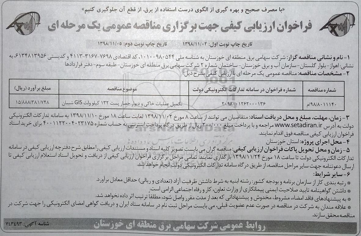 | 98/8011140/ م | 2098001262000136 | تکمیل عملیات خاکی و دیوار حصار پست 132 کیلوولت GIS شیبان |