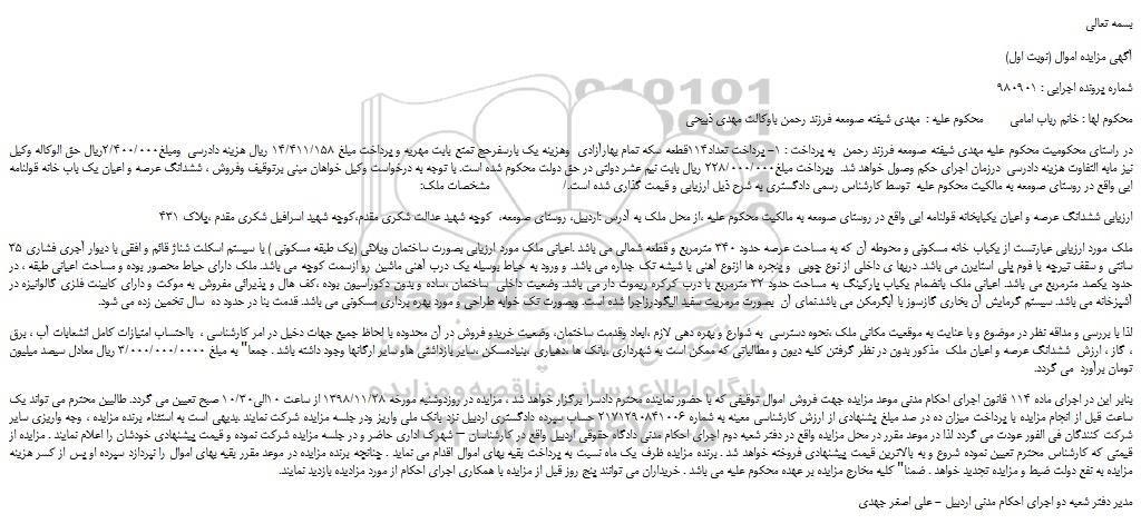 در راستای محکومیت محکوم علیه مهدی شیفته صومعه فرزند رحمن به پرداخت : 1- پرداخت تعداد114قطعه سکه تمام بهارآزادی وهزینه یک بارسفرحج تمتع بابت مهریه و پرداخت مبلغ 14/411/158 ریال هزینه دادرسی ومبلغ2/400/000ریال حق الوکاله وکیل نیز مابه التفاوت هزینه دادرسی درزمان اجرای حکم وصول خواهد شد. وپرداخت مبلغ228/000/000 ریال بابت نیم عشر دولتی در حق دولت محکوم شده است. با توجه به درخواست وکیل خواهان مبنی برتوقیف وفروش ، ششدانگ عرصه و اعیان یک باب خانه قولنامه ایی واقع در روستای صومعه به مالکیت محکوم علیه توسط کارشناس رسمی دادگستری به شرح ذیل ارزیابی و قیمت گذاری شده است./ مشخصات ملک: